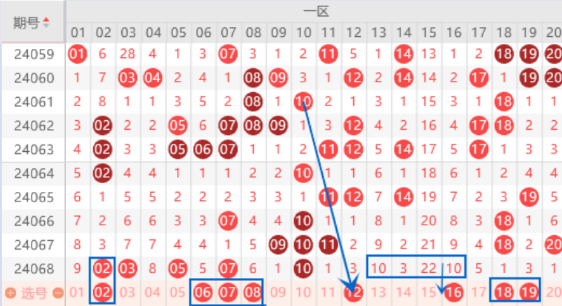 上期开出了02 03 05 07号数字,本期我们要注意出重的情况,重点关注一下02 07号数字出重的情况。本期的夹号04 06号数字我们也是要注意出一个号码的情况。本期的08 09号数字我们也是要注意出一个号码的情况,重点关注一下08号数字的出号情况。本期的12号数字我们注意一下出号情况,属于三斜连号码。本期的13 15 16号数字都是属于冷号,本期我们注意一下出一个号码的的情况,重点关注一下15 16号数字的出号情况。本期的19号数字我们关注一下出号情况。