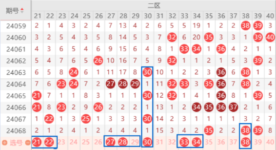 本期的21号数字我们注意一下出号情况,毕竟上期的1尾断号了。本期的27 28 29号数字我们要注意了,本期是要出一个号码了,重点关注一下27 28号数字的出号情况。本期的30号数字我们关注一下,从尾数上来看,出号机会还是很大的。本期的33 34号数字我们注意出一个号码的情况。上期开出了38 39号数字的连号,本期我们注意一下出重号的情况。