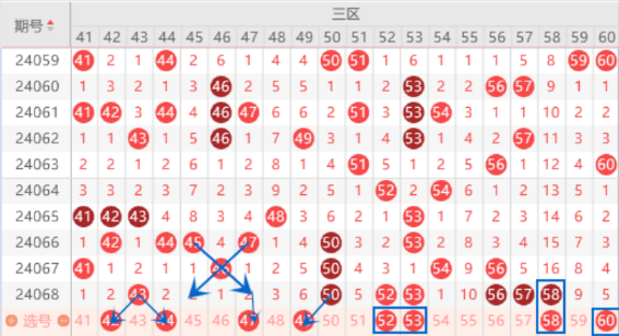 上期开出了43号数字,本期我们注意一下走分边的情况,重点关注一下44号数字的出号情况。本期的45 47号数字是属于交叉对称号码,本期我们防守一下出一个号码的情况。上期开出了50 52 53号数字的连号空一带号,本期我们注意一下出重号的情况,重点考虑一下50 53号数字出重号的情况。上期开出了三连号56 57 58号数字,本期我们注意出一个重号的情况。重点关注一下58号数字出重的情况。