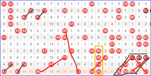 第三区间号码41-60,如果给一词形容三区,我们用要死要活来形容比较贴切。猜中的时候没下单,下单的时候却偏偏没猜中,这不是要死要活是什么。如果下一期三区还有希望的话,我们重点看一下黑色四边形的形态。上一期的梯形图补上一个角,这一期的平行四边形补一条边不为过吧。