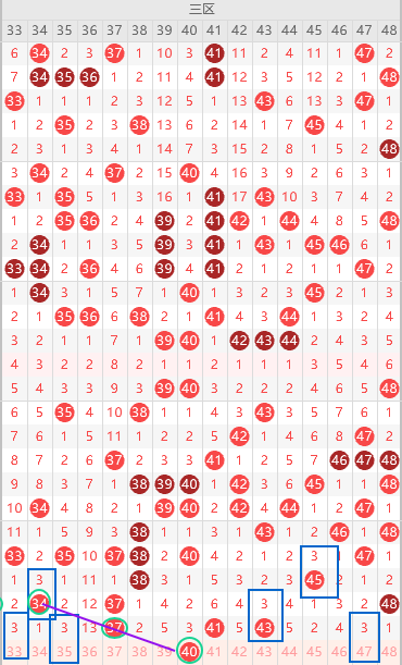 三区胆尾1尾7尾,边号36 38 40 42 44 出一码.重号37 41 43三出一,优先41,形态上40是斜连号,上图已勾画,遗漏值隔三期号出多期,本期只有33 35 40符合,上图已勾画,那就是33 35 40三出一,最近几期三区比较温和,稳定出2-3码,本期有概率走热,建议选号在3-5码区间,昨天34是正点位没出,本期有概率要回补,可以守一期34,三区4开头更热,选号优先4开头,夹子号42可以防守一期,其次8尾防48,结论关注五码34 35 37 41 47防42