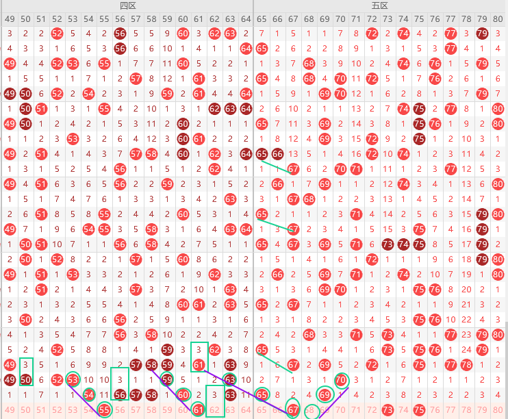 五区胆尾1尾5尾,边号66 68 70出一码,重号65 69出一码,形态上67 68是斜连号,上图已勾画,遗漏值68 71 80三出一,比较看好71,其次5尾短期不单出,本期65 75二出一,9尾69 79二出一,本期79 80概率同出,本期五区可能要走热,冷2期,大概率要回补,稳妥选择3-4码,结论关注五码67 68 71 75 80防73