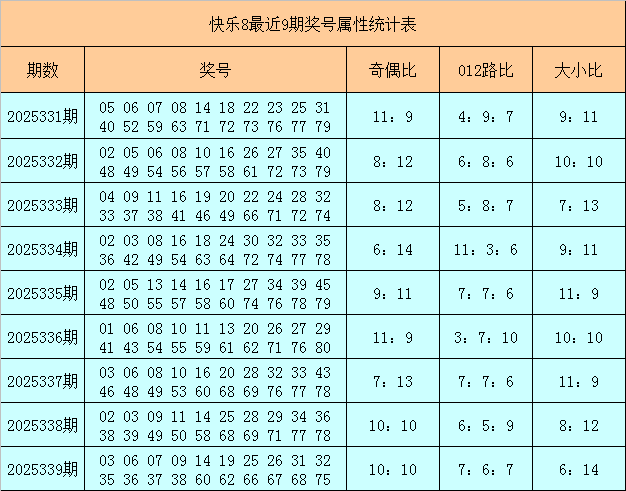 福彩快乐8第2025339期开出奖号:03 06 07 09 14 19 25 26 31 32 35 36 37 38 60 62 66 67 68 75,其中奖号奇偶比为10:10,大小比为6:14,012路比为7:6:7。