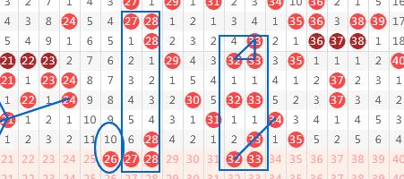 【第二区间21-40】:上期开出3个号码。本期推荐号码:26-27-28-32-33,26为遗漏10期特别号码,27、28周期对子出号考虑,32、33对子上下对称,其中 32三斜连号码,又形成“T”形态,需重点关注。二区间推荐重点号码:26-32-33。