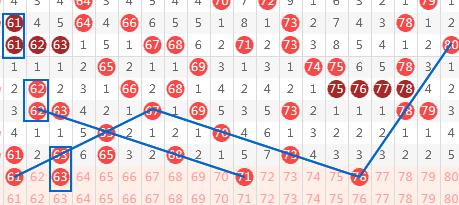 【第四区间61-80】:这个区间上期开出5个号码。本期推荐号码:61-63-71-76,61、63已经形成了等距重号形态,不得不让我把它同时关注,而71需作为四区间不怎么出现的五期同路来防守,他有走势,也许会收到意想不到的惊喜,76是同路四期号码和偶数斜连号码,需要防守。四区间推荐重点号码:61-63-76。