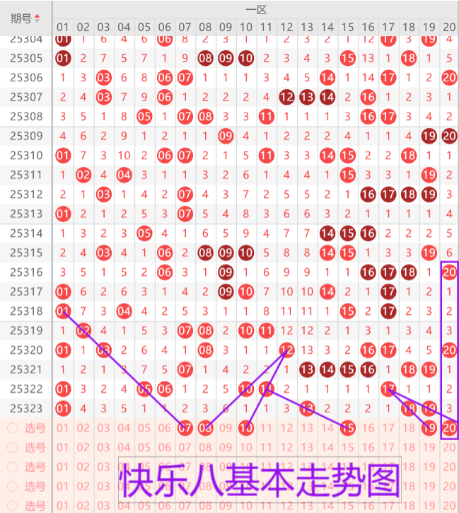 我们来看下一区的基本走势情况,上期开出了四枚开奖号码,本期预测开出4-5枚开奖号码,首先我们来看07 08 10的三斜连形态,建议在07 08考虑二选一。 10考虑收尾走势的空一形态。15的奇数三斜连,19 20 21的堵漏走势建议三选一或者三选二,优先考虑二连形态。