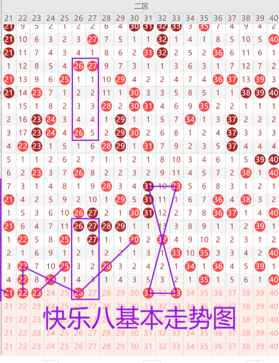 我们来看下二区的基本走势情况,上期开出了四枚开奖号码,本期预测开出3-4枚开奖号码,首先我们来看21 22 23的堵漏形态,优先考虑二连或者23三斜连单出。26的偶数双向三斜连走势。31 33的交叉走势建议二选一,或者考虑两个梅花35和40下方落号。
