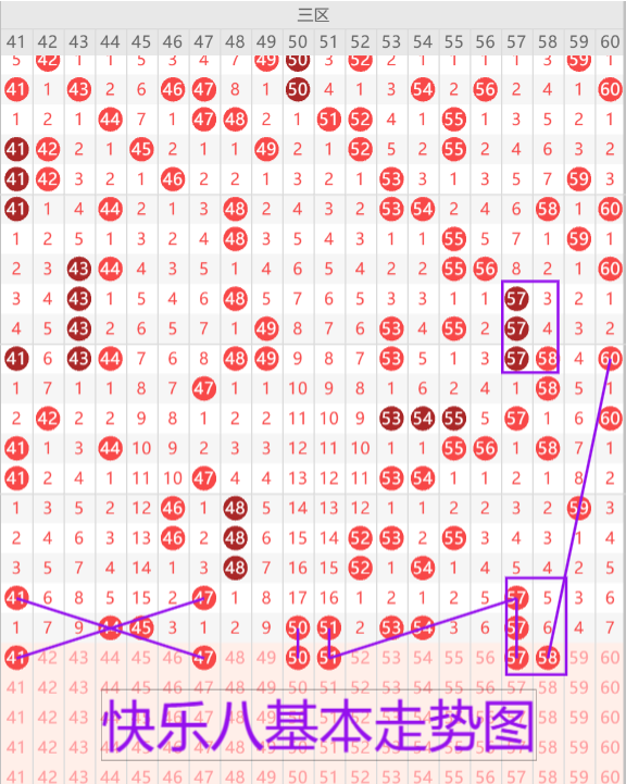 我们来看下三区的基本走势情况,上期开出了七枚开奖号码,本期预测开出3-4枚开奖号码,首先我们来看41 47的同路交叉走势建议二选一。50 51两个冷号同时回补建议二选一考虑做重,57 58的形态复制(如图所示),可以优先考虑二连。