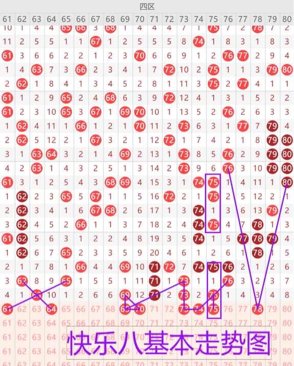 我们来看下四区的基本走势及情况,上期开出了五枚开奖号码,本期预测开出6-7枚开奖号码,首先我们来看61 64的同路交叉走势已建议二选一,尤其重点防守64遗留10期开出。69 71 73 75奇数四连号重号最少四选一,防冷号70开出二连形态(69 70)或者(70 71)。74的堵漏三斜连。78的倒三角三斜连。