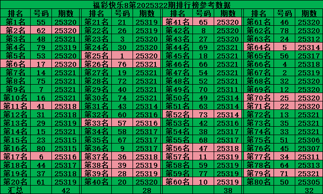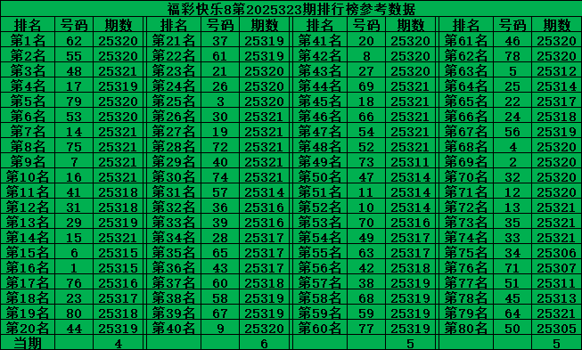 最后再把号码分为四区:一区01-20号、二区21-40号、三区41-60号、四区61-80号,理论上每个区每期应该开出5个号码: