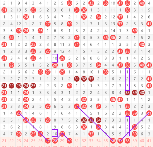 快乐8第083期20~40区域,推荐的第一号码27号,可以看到23斜开24,间隔一期给25,然后再给出27的斜连走势,然后就是28号,它本身是29的分边,也是一个间隔10的对称走势。近几期我们可以看到29开出之后就会给出28和30两个号码,然后再往后就是36和37这两个号码,36有一个吊角对称走势,31间隔一给出33,再出34,再间隔一给出36。形成一个对称的走势,而37也是同样的走势。38我们看到是间隔3的对称走势