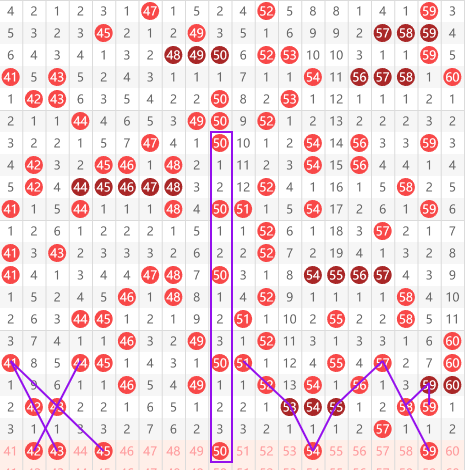 快乐8第083期41-60区域:推荐的第一个号码是42和43,这两个号码有可能同下,我们看到41间隔一给42,再间隔一给43,以及44间隔一给43再间隔壹给42的走势,所以这两个号码有可能同时开出,下面就是45号,我们可以看到41斜着给出43,再给出45的间隔一斜,连中间这个位置昨天没有给出号码,考虑继续放空,其中50号大家可以看一看,是间隔2以及间隔3的两重走势。然后就是54这个号码有点像19号的那个走势,是个十字架走势。再往后就是59这个号码,57间隔一给58,再间隔一给59,而且上面有一个59带着58.59的走势。类似于32和34的走势。