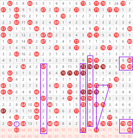 快乐8第083期61-80区域:推荐的第一个号码63是一个梅花号,近期梅花号开出的比较多,所以这个梅花可以考虑。然后就是67好间隔4的对称走势。再往后就是73号,大家看到它和74号的走势是相同的,74号是个两重间隔两期给了个三重间隔,三期给了个74,那么73和它的走势是完全相同的。然后就是75号这个倒三角没有开出推荐继续打。最后就是80号,大家看到紫色方框里标注的上下对称的走势。