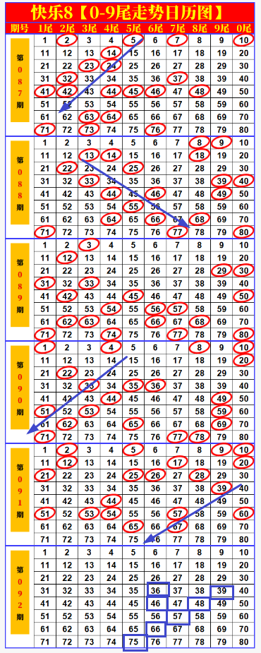 本期画线思路概括:我这几期对斜连号是情有独钟,隔了一期后,我又想着从右侧尾号图做个斜连号。本期通过重号39,敲定数字39到75的斜连号组合形态。上期想着6尾号能走热,可惜没出几个,本期继续防守一下6尾号组合,比较看好的是数字46,结合66形成三角形态。