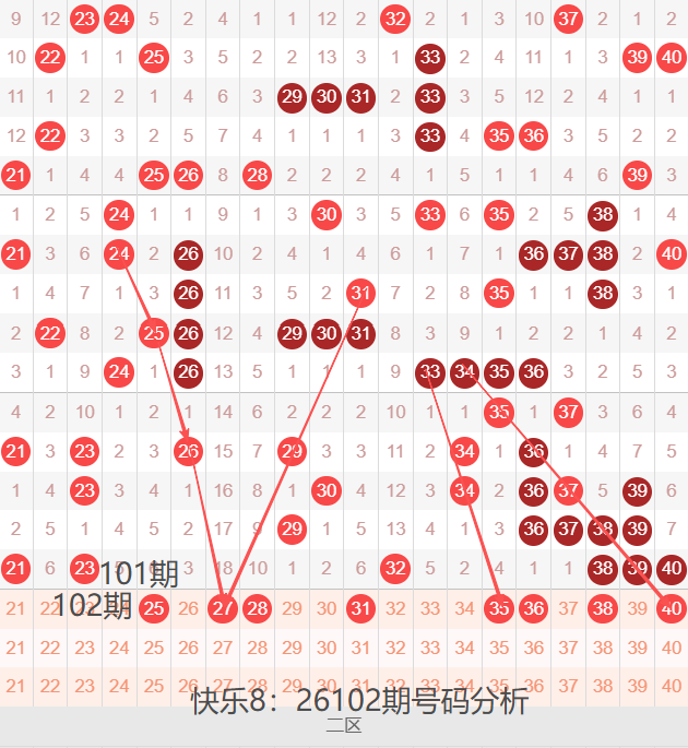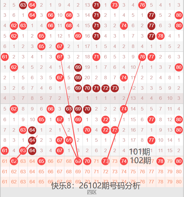 回顾26101期开奖号码:04 06 11 18 21 23 32 38 39 40 45 46 50 52 55 59 61 63 64 67 ,最近一段时间号码爆区几率特别高,目前已经连续多次出现爆区热开的情况,爆区之后基本上都是迅速回调,转换至其他区间继续暴热,大家若是能抓准区间,或许有很大的机会,但是号码的变盘规律是非常的快,很难把握,个人建议谨慎选择,不要 盲目的去操作~~