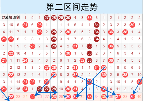该区间上期出现了三连号26 27 28号,这是近5期来出现的第一个三连号,所以本期落重号的机会非常大,这里我们要注意26 28落重号的可能。25号是属于包饺子了,近期包饺子的号码出的很频繁,我们不得不防守一下。31 33 35号形成了三角形,那么本期的中心号33号我们就要做防守了,重点还是放在角重号31 35上就可以。