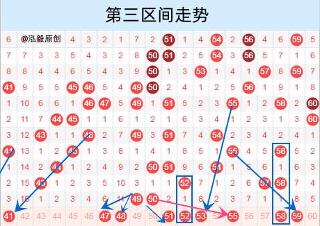 上期在35到49号之间断号了,该区间有三个冷号37 42 48,那么本期我们就要注意了,开出1-2个的机会是非常大的。其中37 48都是遗漏11期的号码,所以我们可以在这里挑一码出来。该区间的51 52 53本期我们要注意一下,出3连号的机会还是比较大的,要做好防守。59号已经追了3期了,本期在追一期,不出就可以放弃了,等他出来我们在做打算吧。