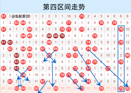 该区间的中心对称号63 64 65本期我们要注意回补号码的出现,重点关注63号的回补情况。上期中心对称号67 68 69回补了67号,那么本期我们就要注意69号的回补情况了,要做好防守。73号也是属于包饺子的号码,我们也是要防守的。本期的01号数字应该要断号了,那么80号数字我们就不能错过了。