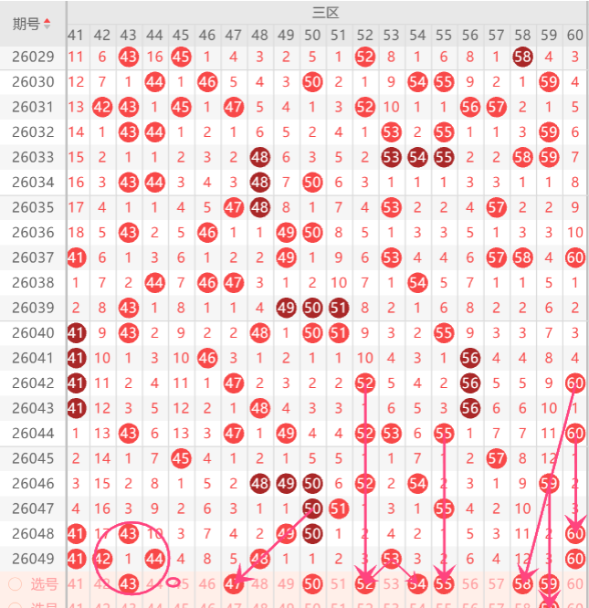 而三区的打底号是44.48.51.52.54.55.56.58.59中参考2-3码开出机会,