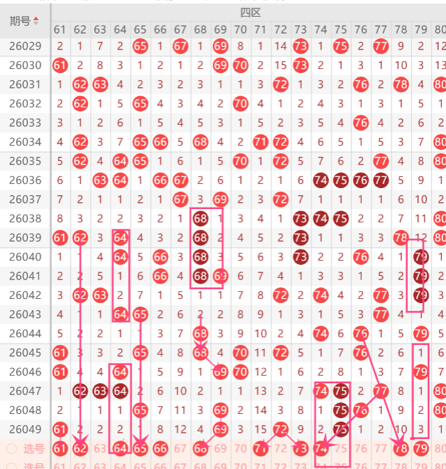 四区间的打底号是61.64.65.66.67.68.70.73.74.78.79参考4-5码开出机会