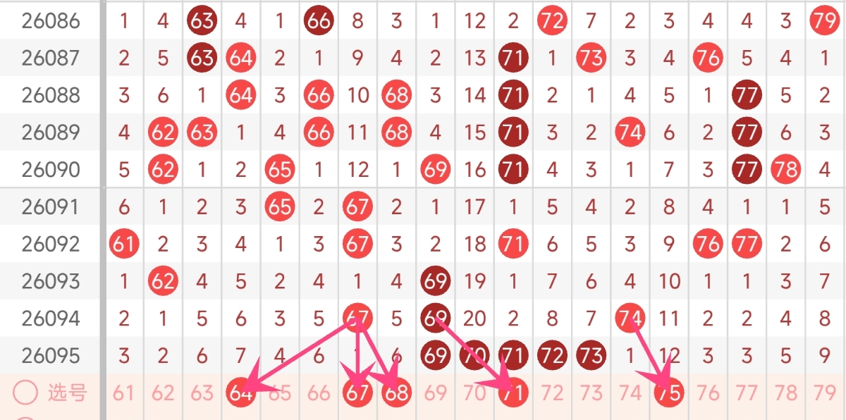 上期直接开出69、70、71、72、73一共5枚号码,并且全部扎堆在区间末端形成了超长连号,这属于比较极端的出号情况,根据物极必反的原理,本期区间出号量大概率会回落至3-5枚,并且会向区间中前段分散。而且还需注意其他已经连续多期漏出的号码,本期有几率回补综合考虑,本期四区推荐关注号码:64、67、68、71、75