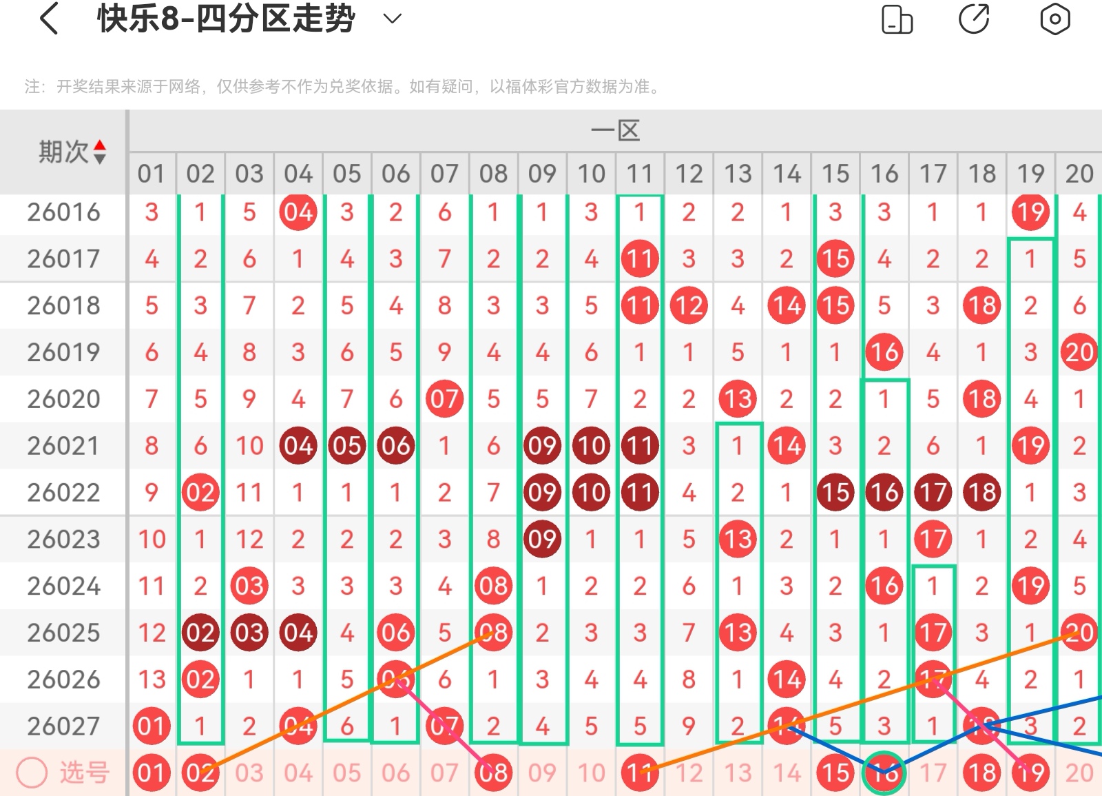 快乐八第26028期基本走势分析(上期会员文章选二守号中一组,空三中心号中)