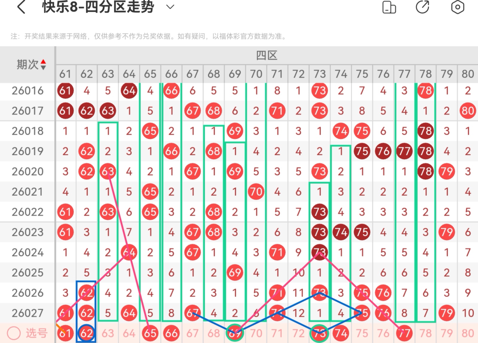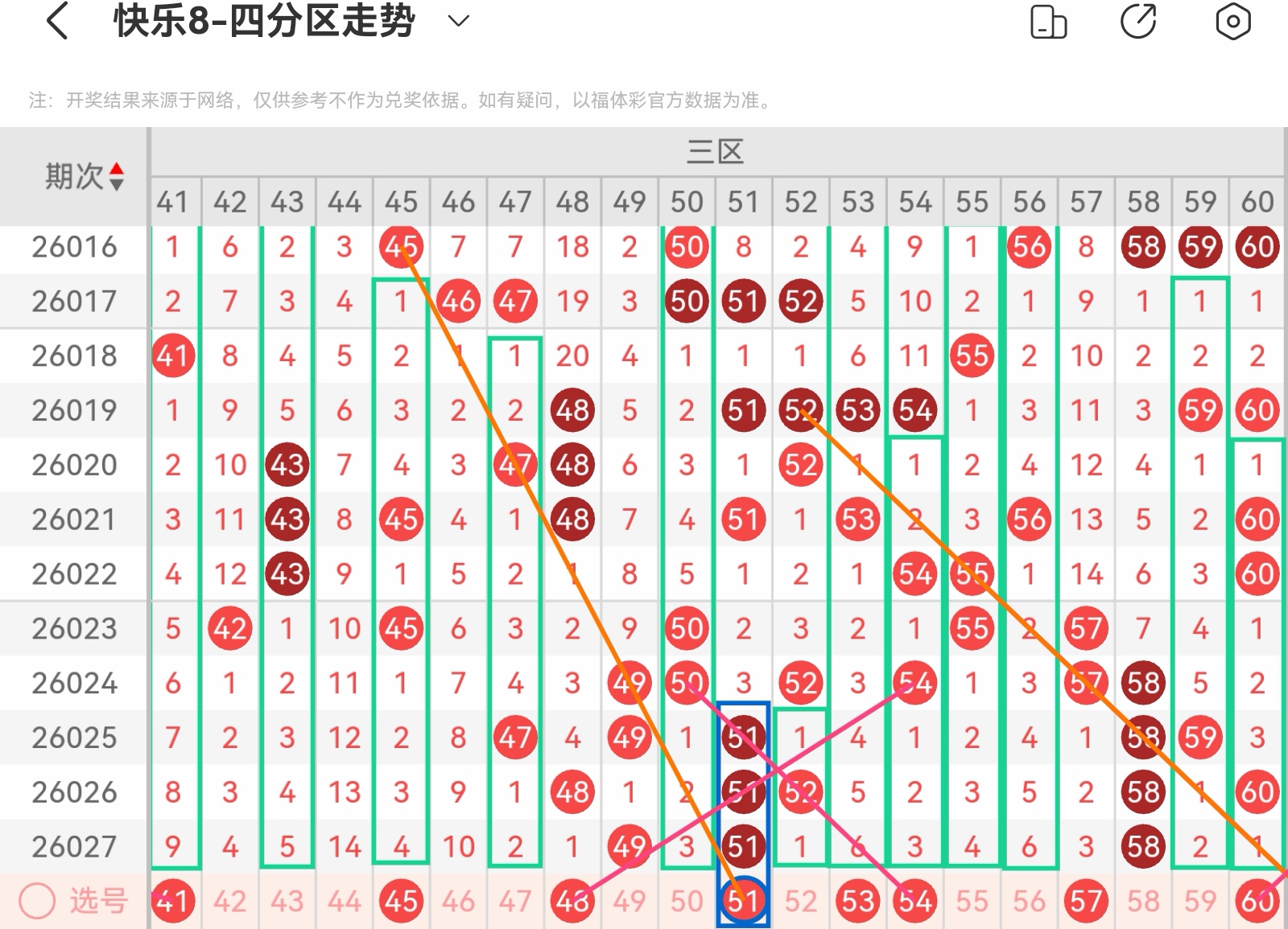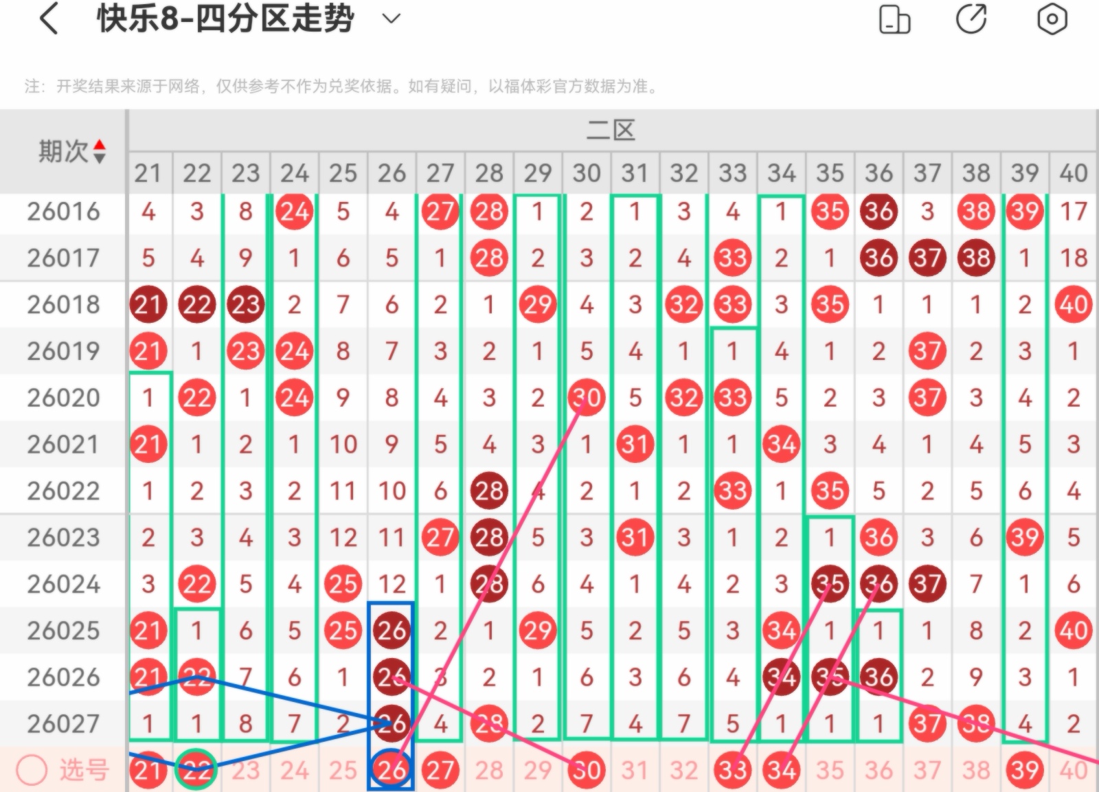 大家好,我是甜丝丝的坏事,主要以快乐八的形态走势、空位走势、遗漏走势以及斜连走势相结合的方法,用公认的四分区走势来进行预测分析,希望能让你有所收获。