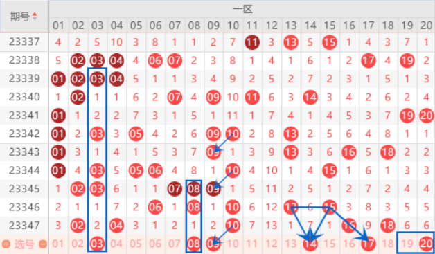 本期的03号数字我们做一下防守就行了,02 04夹03的情况不是很多。本期的08号数字我们注意一下,毕竟上期10号数字的重号,本期有可能会把08号数字带出来的。本期的09号数字我们也是关注一下,出号机会也是有的。本期的14号数字是属于遗漏7期的号码,本期遗漏7期的号码有5个,应该是要出一个的,我们要注意一下。本期的17号数字也是属于夹号类型,我们注意一下出号情况,本期的19 20号数字我们要注意落下一个号码的情况。