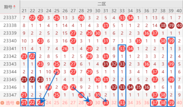 该区间的22 23号数字本期我们要注意落下一个号码的情况,22号数字是属于空二对称号码,23号数字是属于212走势,出一个号码应该是没有问题的。本期的29号数字我们注意一下,做防守是最好的,毕竟28 30夹29的情况是不多的。本期的31号数字我们注意一下,出号机会还是有的。5连号32 33 34 35 36号数字本期我们要注意落下一个号码的情况,本期我们重点关注一下32 33号数字落号的情况就行了。上期开出了37 38号数字的连号,本期我们注意出重的情况。本期的39号数字也是212走势,我们注意一下出号情况。