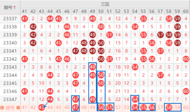 本期的43号数字我们做一下防守,毕竟是个冷号,不一定会出号的。上期开出了47 49号数字,本期我们注意一下出重号的情况。本期的50号数字我们注意一下,一直都在模仿49号数字的出号情况,出号机会还是有的,本期我们注意一下51号数字的出号情况,它是属于525走势,出号机会还是有的。本期的55 56号数字我们注意一下出一个号码的情况,连号58 59号数字我们也是要注意出一个号码的情况的。