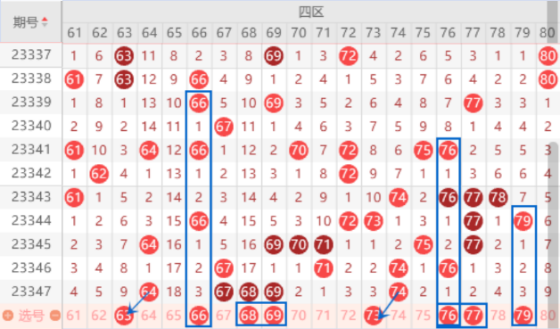 该区间的63号数字我们注意一下,属于919走势,出号机会还是有点的,可以防守一下。本期的66号数字是属于123走势,本期的123走势有两个号码,本期我们要注意出一个号码的情况。上期开出了三连号67 68 69号数字,本期我们要注意出一个重号的情况,重点关注一下68 69号数字就行了。本期的73号数字我们注意一下,出号机会还是有的。本期的76号数字我们也是要关注一下的,属于121走势,出号机会也是有的。