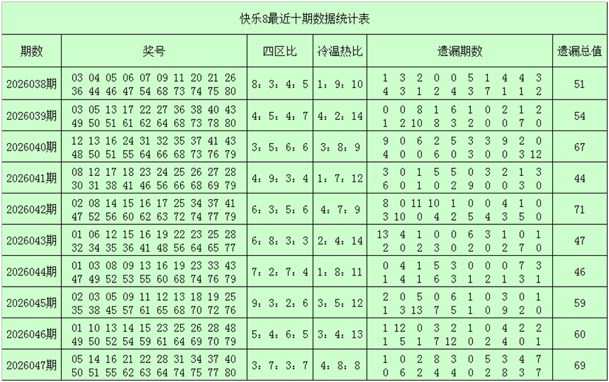 一、快乐8第2026048期奖号分析(定义:遗漏0-2期号码为热码,遗漏3-6期号码为温码,遗漏7期及7期以上号码为冷码,重码为上期开出奖号,邻码为上期没有出现,但与上期奖号差值为1的号码,例如上期开出奖号04,没有出现号码03和05,则本期03和05都为邻码,其它则为孤码。