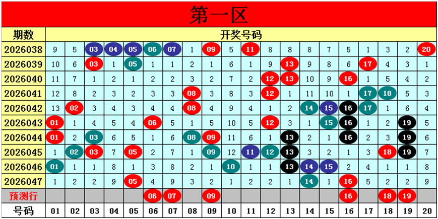目前第一区包含14个热码:重码3个05、14、16,邻码2个13、15,孤码9个01、02、03、09、10、11、12、18、19;包含3个温码:邻码2个06、17,孤码1个08;包含3个冷码:邻码2个04、20,孤码1个07;号码冷温热个数比为3:3:14,重号、邻码、孤码个数比为3:6:11。