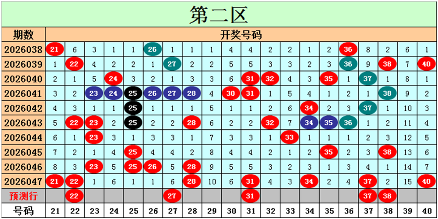 目前第二区包含12个热码:重码7个21、22、28、31、34、37、40,邻码3个23、35、38,孤码2个25、26;包含6个温码:邻码5个27、30、32、33、36,孤码1个24;包含2个冷码:邻码2个29、39,孤码0个;号码冷温热个数比为2:6:12,重号、邻码、孤码个数比为7:10:3。