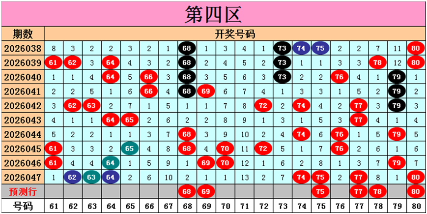 目前第四区包含15个热码:重码7个62、63、64、74、75、77、80,邻码4个61、65、76、79,孤码4个68、69、70、72;包含1个温码:邻码0个,孤码1个66;包含4个冷码:邻码2个73、78,孤码2个67、71;号码冷温热个数比为4:1:15,重号、邻码、孤码个数比为7:6:7。