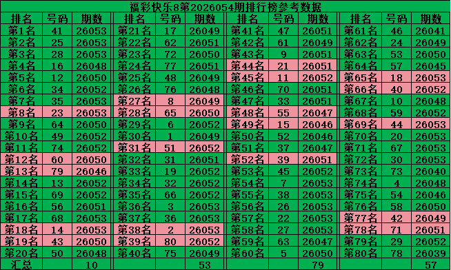 先把15期号码按照出现次数排位分为四区:第1-20位为热一区,第21-40位位温热二区,第41-60位为温冷三区,第61-80位为冷四区,从汇总数据可以看到,短期数据出号都是在温冷三区,出号最少的反而是热一区,我们的重点就在温冷三区!再把80个号码分为8个区,一区01-10号,二区11-20号,三区21-30号、四区31-40号,五区41-50号,六区51-60号,七区61-70号,八区71-80号,把每个区分为冷热:热号是出现次数前5位,冷号是后五位,根据走势综合分析(区间大小看尾数:12345小,67890大;区间奇偶看尾数:13579奇,02468偶;区间012路看尾数:0369是0路,147是1路,258是2路)四种数据中出现3-4次的号码优先考虑: