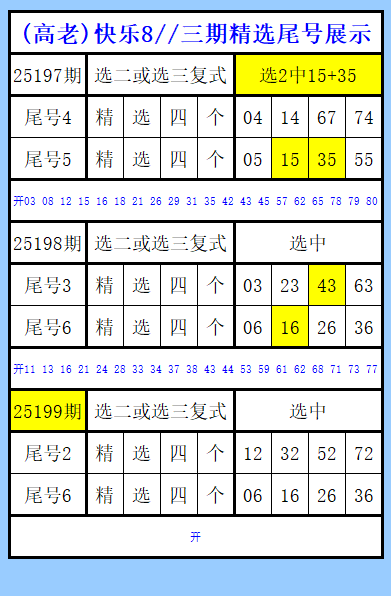 快乐8第199期图文(高老马),精选尾号展示,上期围中选四11+21+61+71