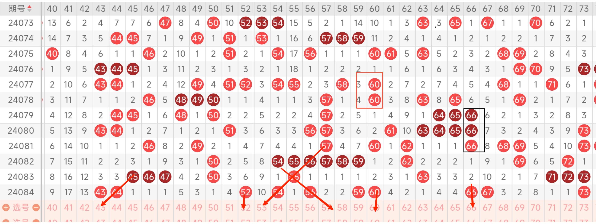 区间分析:三区的号码球在24083期开出五个号码和24084期开出七个号码球的走势,三区的热度在近二期是明显上升趋势,本期的三区开出六个号码球的可能性是比较大的,号码球57号球在24078期-24082期是五连出走势本期可以预防号码球57号球的开出走势和注意号码球43号球的二连出走势和斜开奖走势开出和注意号码球53号球的斜开奖走势开出和预防号码球52号球的二连出走势和号码球60号球的二连出走势(号码球60号球在24077期-24078期是二连出走势)和预防四区的号码球66号球的连出走势(号码球66号球在24079期-24081期是三连出走势)