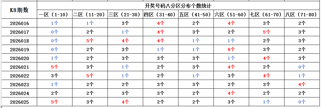 首先看上期回顾,“快乐8”第26025期开奖结果:2.3.4.6.8.13.17.20.21.25.26.29.34.40.47.49.51.58.59.69;通过分析开奖号码,分享第一个数据分析:统计开奖号码的八分区冷热走势,判断出号规律。以近10期开奖号码的八分区统计数据为例: