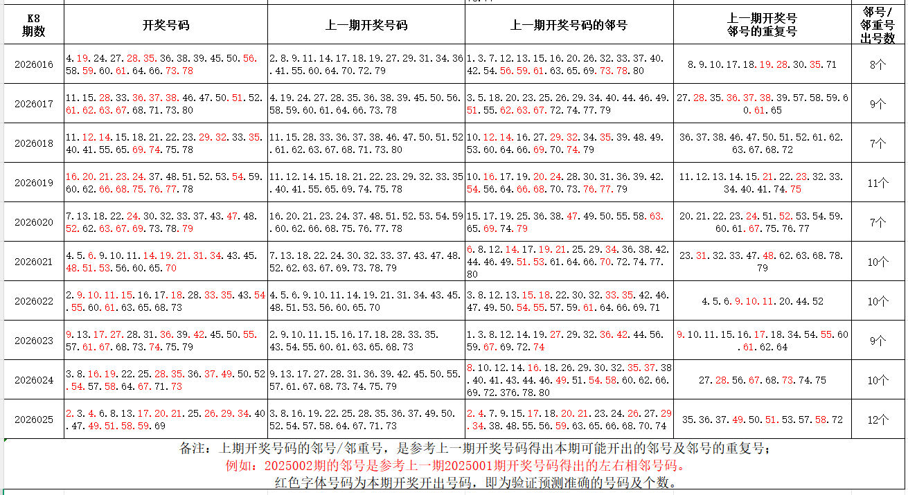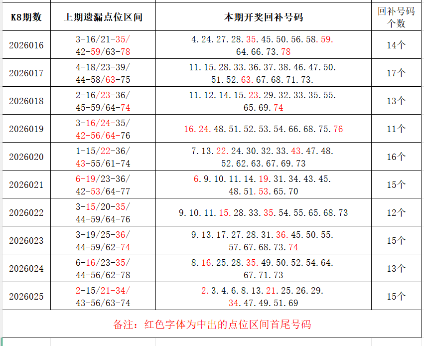 如图,上期的遗漏号码在下期开出10个左右,即为回补号码。定准点位区间首尾号码是关键!以上期2026025期为例,定位4个遗漏区间,围中15码!结合上期开奖号码,以跨度值大于或等于7为依据,本期关注4个遗漏区间:40-47/51-58/59-69/69-80;重点关注遗漏区间:5-16/24-39/46-58/63-79。点位区间号码和大底号码请勿混淆,个人分析,仅供参考。