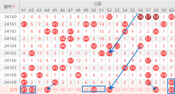 该区间的42 44号数字我们要注意出一个号码的情况,由于上期开出了33号数字,本期我们防守一下44号数字的出号情况。本期的52号数字我们要重点关注一下,属于斜连号码,和上次的52号数字是属于同样的走势,是有机会开出来的。本期的58号数字我们也是要重点关注一下的,上期开出了57号数字的重号,本期我们注意走分边的情况。