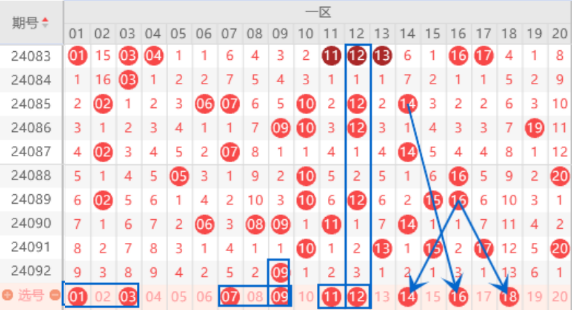 本期的01 04 07号数字做一下防守就行了,本期还不一定会出号,本期不出我们下期可以做胆码了。本期的03号数字是属于遗漏8期的号码,本期遗漏8期的号码有5个,出1-2个应该是没有问题的,我们重点关注一下03 25号数字的出号情况就行了。本期的12号数字我们重点关注一下,属于123走势,出号机会是很大的,我们可以防守一下11 12号数字同出的情况。本期的16号数字我们也是要重点关注一下,属于斜连号码,本期可以防守一下14 16号数字同出的情况。