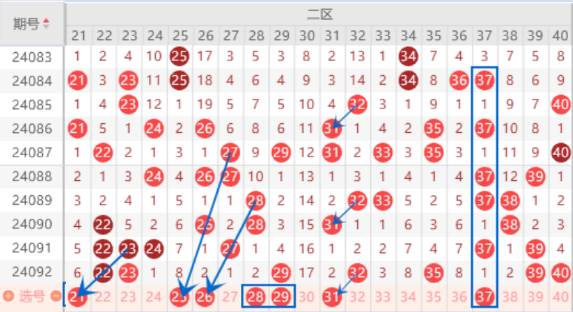 本期的21号数字我们关注一下出号情况,上期的22 23号数字又开出来,那么本期出现21号数字的机会就大了。本期的26 28号数字我们注意出一个号码的情况,看好28号数字可以防守28 29号数字同时出的情况。本期的31号数字是属于空二对称号码,出号机会还是有的,我们注意一下。本期的37号数字是属于空一对称号码,出号机会也是有的,可以重点关注一下。