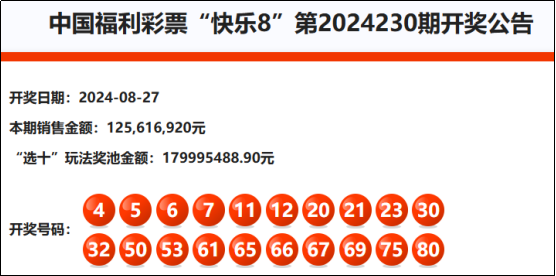 首先我们先来回顾快乐8第2024230期开奖号码: