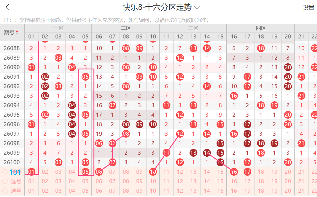 上期一区间开出7码,走热形态,【03-05-07】奇数连号,同尾【15-17】,孤码【20】和连号邻码【12】,本区间无大遗漏号,本期继续关注热码,【01】是错位的空3-5-4走势,上期开出【03-05-07】我们需要关注其一落重和邻码偶数回补,本期看【05-06】对子,【10】空一斜连,【16】空3-3,又是斜三连走势,【17】近期下落容易落重,有望一起下落,本区间本期一区间看大底【01-05-06-10-16-17】,一区间胆码:【01】