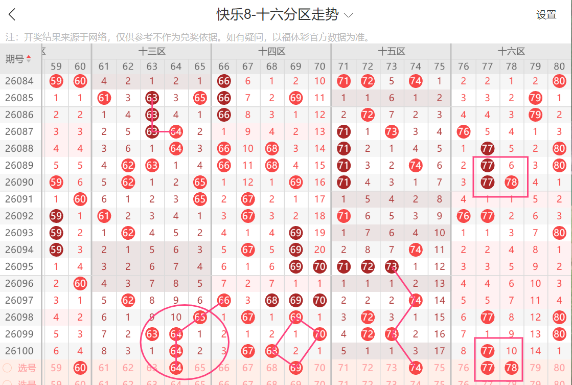 上期四区间开出4个号,四区间近期开出三重,连号,斜连走势,孤码落重比较多,本期很大概率下落回补,上期【64】空10双重下落,本期看它有很大概率下三重,斜连尾巴落重走势,【69】空1-0-2的长方形走势,又是上期对子【67-68】的邻码,本期看它落号,【75】期遗漏17期,要下可能需要邻码先下落做铺垫,本次看闪电⚡️走势和不规则的空4-2-3走势的【74】有机会下落,【77】本期看落重,有望和空10的【78】一起下落,本区间关注【64-69-74-77-78】,四区间胆码:【74】
