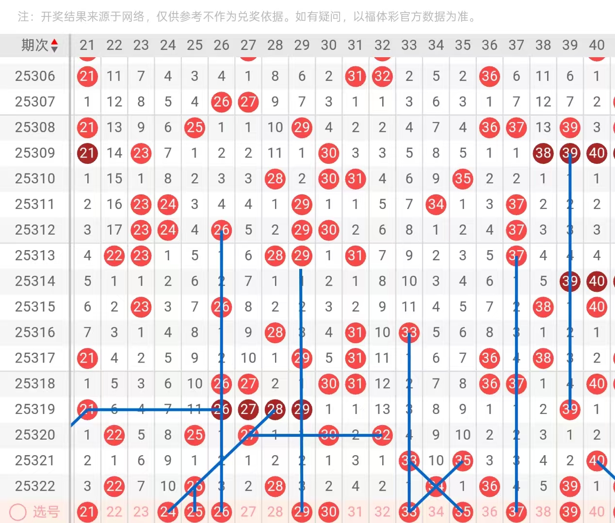 二区:二区间上期开出了六码,二字头头部位置开出空一回补的22与25,尾部位置空二回补的28,3字头开出头部位置35的孤码双分边34-36,尾部位置也仅仅开出40的孤码分边39。本期2字的头部位置优先考虑22-25的两码三期遗漏回补,其次防守空一回补的26,3字头头部位置32-33-34-35-36四连号下面可考虑一码的座重,关注分边号码31-36二选一,上期37以孤码形态开出,本期可关注做重,其次防守38-39-40连号的一码空二回补。