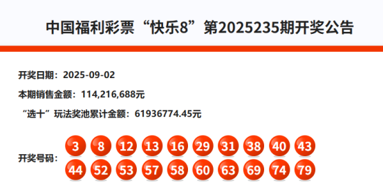首先我们来回顾快乐8第2025235期开奖号码: