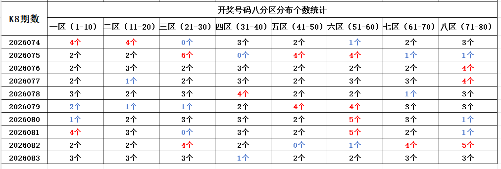 首先看上期回顾,“快乐8”第26083期开奖结果:1.2.7.13.14.18.23.27.28.38.41.48.51.54.63.65.68.71.75.78;通过分析开奖号码,分享第一个数据分析:统计开奖号码的八分区冷热走势,判断出号规律。以近10期开奖号码的八分区统计数据为例: