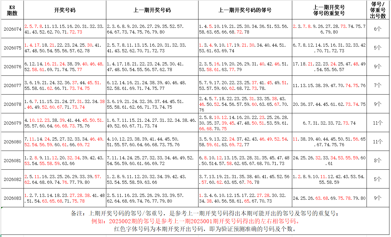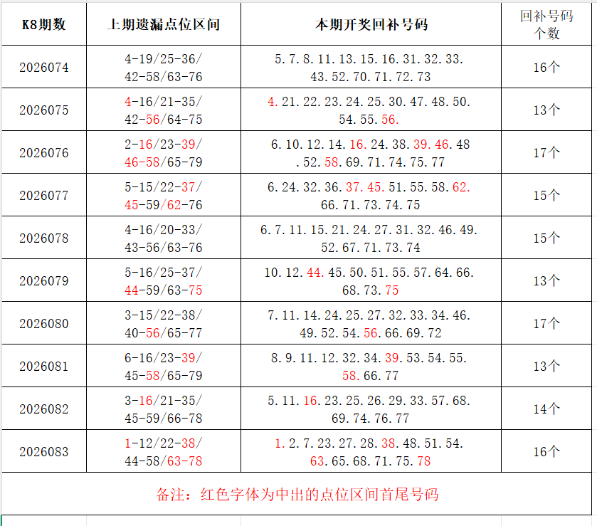 如图,上期的遗漏号码在下期开出10个左右,即为回补号码。定准点位区间首尾号码是关键!以上期2026083期为例,定位4个遗漏区间,围中16码!结合上期开奖号码,以跨度值大于或等于7为依据,本期关注3个遗漏区间:28-38/41-48/54-63;重点关注遗漏区间:3-15/22-36/42-58/64-79。点位区间号码和大底号码请勿混淆,个人分析,仅供参考。